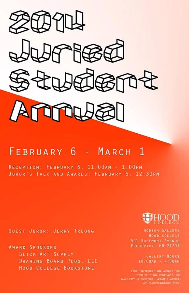 An exhibit of artwork created by Hood College graduate and undergraduate students will be on display in the Hodson Gallery at Hood College. An opening reception for 2014 Annual Juried Student Exhibit will be Feb. 6 from 11 a.m. to 1 p.m. A talk by Jerry Truong, juror for this exhibition, will be given Feb. 6 at 12:30 p.m., followed by the awards presentation. The exhibit includes ceramics, drawings, paintings, prints and photographs.